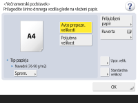 Za velikost papirja lahko nastavite možnost <Poljubna velikost>, tako da vam ni treba vnašati nastavitve za velikost papirja. Možnost <Poljubna velikost> izberite, ko za kopiranje nalagate papir, katerega velikosti ne poznate, ali če je velikost papirja že registrirana v gonilniku tiskalnika.