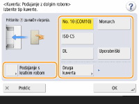 Če ste spremenili postavitev kuvert, pritisnite <Podajanje s kratkim robom> ali <Podajanje z dolgim robom>, nato pa izberite vrsto kuverte.