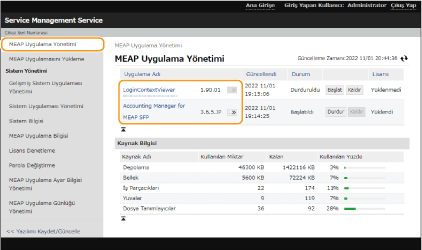 MEAP uygulamasına bağlı olarak uygulamayı yeniden başlatmanız (durdurmanız ve başlatmanız) gerekebilir. MEAP Uygulamalarını Yönetme