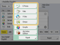 Taranmış belgeler gönderilirken kullanılması için bir alıcının faks numarasını veya e-posta adresini Adres Defterine kaydedebilirsiniz. Bir I-faks hedefini, dosya sunucusu klasör konumunu (IP adresi ve yol) ve bir Canon çok fonksiyonlu yazıcının depolama alanını da (Gelişmiş Alan) hedef olarak Adres Defterine kaydedebilirsiniz.