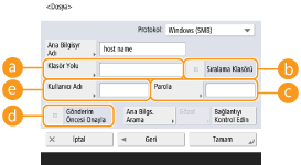 bölümündeki kullanıcı adından ve bölümündeki paroladan farklı bir kimlik doğrulama yöntemi kullanabilirsiniz. Daha fazla bilgi için bkz. <Dosya İlt/Gözatma Kml Doğr. İçin Kullanılan Bilgi>.<Protokol> seçeneğini <Windows (SMB)> veya <FTP> olarak ayarlarsanız <Klasör Yolu> üzerinde mevcut olmayan bir klasörün belirtilmesi, klasörün otomatik olarak oluşturulmasına ve dosyaların bunun içinde depolanmasına neden olur. Ancak birden fazla düzeye sahip olan bir klasör belirtirseniz gönderme hatası oluşur.