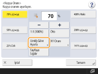 <Oto> seçeneğini ayarlarsanız, kağıt boyutunu manüel olarak seçmeniz gerekir. Bir kağıt boyutu seçmezseniz, kopya oranı kağıt çekmecesi 1’e yüklenen kağıdın boyutuyla eşleşecek şekilde otomatik olarak ayarlanır.