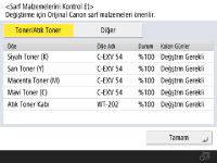<Kalan Günler> içeriğinde <Değştrm Gerekli> görüntülense bile durum görüntüleme alanında (dokunmatik panel ekranının altında) sarf malzemelerini değiştirmenizi isteyen bir mesaj görüntülenene dek değiştirme işlemini gerçekleştirmeyin.