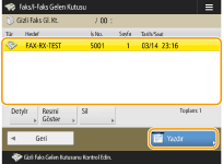 Bu fonksiyon, belirli koşulları karşılayan alınan belgeleri belirlenen saklama konumuna (Gizli Faks Gelen Kutusu) kaydetmek içindir. Gizli Faks Gelen Kutusu birden fazla kutu içerir ve her bir kutu parola ile korunabilir. A Şirketinden gelen tüm belgeleri Kutu No. 10’a kaydet gibi bir koşul belirleyerek, yalnızca ihtiyacınız olan belgeleri kontrol edebilirsiniz. Bu fonksiyon ayrıca bir parola belirleyerek yetkisiz kişilerin gizli belgeleri yanlışlıkla görmelerini önlemenizi de sağlar. Kontrol panelindeki İşleme/Veri göstergesi sabit yeşil durumunu koruduğunda, kaydedilen belgeleri kontrol etmek / yazdırmak için aşağıdaki yordamları takip edin.
