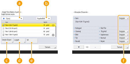 Özel kağıt tipinin ayarlarını kaydettiğinizde adını değiştirmeyi unutmayın. Makineye kayıtlı varsayılan kağıt tiplerinin ayarlarını değiştiremezsiniz.