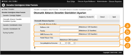 [Otomatik Aktarım Denetim Günlükleri Ayarları] seçeneği etkinse denetim günlüklerini manuel olarak silemezsiniz.