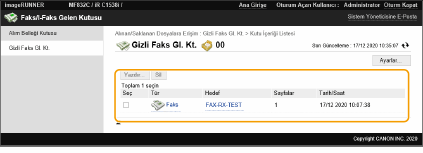 Gizli Faks Gelen Kutusu ayarlarını değiştirmek için4. adımda gösterilen ekranda [Ayarlar] seçeneğine tıklayarak Gizli Faks Gelen Kutusu’nun adını ve PIN’ini değiştirebilirsiniz.