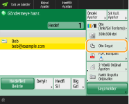 <Orij. İçerik Yönlendirmesi> seçeneğine basın, orijinalin yönüne göre <Uzak Kenarda Üst> veya <Yan Kenarda Üst> seçeneğini belirleyin ve <Tamm> seçeneğine basın.Fakslar dahil birden fazla hedef belirleme<Tarama ve Gönd. Fonksiyonunda Faksı Etkin Kıl> öğesini <Açık> olarak ayarlamak Tarama Temel Özellikleri ekranında (<Faks Fonksiyonunu Göster>) faks hedeflerini belirlemenizi sağlar. Bu ayar, fakslar dahil birden fazla hedef belirlerken kullanışlıdır, örneğin, gönderilen faksın kopyasını bir dosya sunucusuna kaydederken.