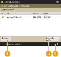 Bellek ortamını çıkarmak için basın. Bellek ortamını güvenli şekilde çıkarmak için bu düğmeye bastığınızdan emin olun. Nasıl çıkarılacağı hakkındaki talimatlar için bkz. Bellek ortamını çıkarma.