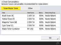 می توانید مقدار باقیمانده مواد مصرفی را از Remote UI (واسطه کاربر از راه دور) بررسی کنید. بررسی وضعیت دستگاه