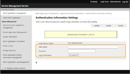 Saio-hasieraren aplikazioa aldatu bada, berretsi berriro autentifikazio-informazioa hemen: [Ezarri MEAP autentifikazioa]. Baliteke beharrezkoa izatea autentifikazio-informazioa berriro sartzea.