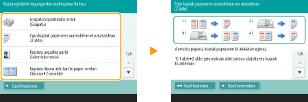 Ikusi funtzioen gida eta ohiko galderen orriaSakatu <Tutoriala/Ohiko galderak> makinaren funtzioekin egin dezakezuna erakutsiko dizun pantaila eta kopiatzea, eskaneatzea eta abar erabiltzeko gomendioak bistaratzeko. Ikusi pantaila hori gehiago jakiteko erabilgarri dauden funtzioen inguruan eta horiek nola erabili jakiteko. Ohiko galderen orrira gailu mugikor baten bidez ere sartu zaitezke.