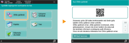 <Ohiko galderak> sakatuta, QR kode bat agertzen da. Ondoren, makinaren ohiko galderen orria bistara dezakezu QR kode hori eskaneatuz gailu mugikor batean, adibidez, smartphone batean edo tableta batean.