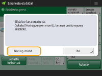 (Gelditu) bidaltzeko hainbat lan daudenean bidaltzeko lanak bertan behera uztea hautatzeko pantaila bistaratzeko. Bertan behera utzi nahi duzun lana bidaltzea bistaratzen ez bada, sakatu <Beg. beste lan batzuk> <Bidali lanak> bistaratzeko. Hautatu ezeztatu nahi duzun lana eta sakatu <Utzi>.Bidalitako/gordetako dokumentuen egoerak egiaztatzeko<Egoera-monit.> pantailan, bidalitako/gordetako dokumentuen egoerak egiazta ditzakezu. Pantaila honek dokumentuak berriro bidaltzea/gordetzea edo egoerak egiaztatu ondoren bidalketa/gordetzea bertan behera uztea ahalbidetzen dizu. Eskaneatutako dokumentuen egoera eta erregistroa egiaztatzea