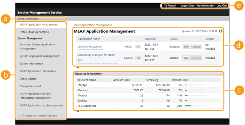 بالإضافة إلى التحققق من التفاصيل وتغيير الإعدادات، يمكنك ترقية تطبيقات MEAP أو إلغاء تثبيتها باستخدام خدمة SMS من Remote UI (واجهة المستخدم عن بعد).
