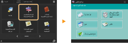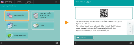 استعراض دليل الوظائف وصفحة الأسئلة الشائعةاضغط على <البرنامج التعليمي/الأسئلة المتداولة> لعرض شاشة تُعرّفك بما يمكنك القيام به باستخدام وظائف الجهاز بالإضافة إلى إرشادات خاصة باستخدام النسخ والمسح الضوئي، إلخ. استعرض هذه الشاشة عندما ترغب في معرفة المزيد عن الوظائف المتوفرة وكيفية استخدامها. يمكنك أيضًا الوصول إلى صفحة الأسئلة الشائعة من الجهاز المحمول.