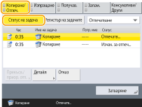 Ако натиснете  (Стоп) на контролния панел, докато се показва екранът с основни функции за копиране, задачата за копиране се спира на пауза и се показва съобщението <СтопИзберете зад.за коп., която желаете да отмените.> заедно със списъка със задачи за копиране. Можете да изберете задачата за копиране от списъка и да откажете задачата чрез натискане на <Отказ>.