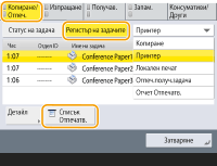 (Настр./Регистр.) <Настройки за управление> <Управление на устройства> <Огранич. достъп до задачи на други потребители> е зададено на <Вкл.>, задачи, различни от тези на влезлия потребител, са показани като "***" и не могат да бъдат обработени. Ако влезете с администраторски привилегии, се показват заданията на всички потребители. |