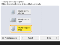 Prilikom kopiranja izvornika koji su manji od izlaznog formata papira, na kopiranoj slici mogu se pojaviti crte okvira izvornika. Prilikom kopiranja debele knjige mogu se pojaviti tamni obrubi. <Brisanje okvira> omogućuje brisanje tih crta okvira i tamnih obruba. Uređaj možete podesiti da ne kopira rupe od bušilice za papir na izvornicima.