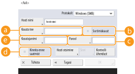 Kui valite <Windows (SMB)>, kuvavad nupud <Hosti otsimine> ja <Sirvi>. Saate hõlpsasti määrata failiserveri/Täiustatud postkasti otsides või võrku kuvades.