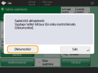 Kui valik <Kuva märguanne töö aktsepteerimisel> on seatud olekusse <Sees> saate kuvada valiku <Oleku monitor> järgnevalt kuvalt pärast saatmistöö vastuvõtmist. <Kuva märguanne töö aktsepteerimisel>