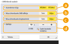 Kui <Nõua ühenduseks krüpteerimist> on olekus <Sees>, saab seadme ühendada ainult SMB-serveritega, mis toetavad SMB 3.0/3.1 krüptitud ühendust. Kui seade <SMB-kliendi versiooni määramine> jaoks on <1.0> ja <2.0> olekus <Sees> aga <3.0> ei ole olekus <Sees>, ei saa seadet ühendada SMB-serveritega, mis ei toeta SMB 3.0 krüptitud sidet.