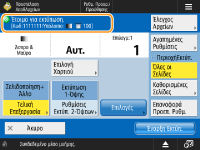 Εμφανίζει την κατάσταση ρυθμίσεων, όπως μέγεθος χαρτιού για την εκτύπωση και πλήθος εκτυπώσεων. Βεβαιωθείτε ότι έχετε επιβεβαιώσει τις ρυθμίσεις για να εκτελεστεί σωστά η εκτύπωση. Για να αλλάξετε τις ρυθμίσεις, πατήστε το κουμπί κάτω από το τμήμα της οθόνης. Για να αλλάξετε το πλήθος των εκτυπώσεων, πληκτρολογήστε τον αριθμό χρησιμοποιώντας τα αριθμητικά πλήκτρα.