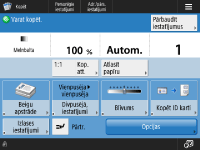 Varat mainīt ekrānu parādīšanas iestatījumus, piemēram, noteikt, kurš ekrāns tiek parādīts uzreiz pēc iekārtas ieslēgšanas, un vai tiek parādīts ziņojums par atlikušo papīra un tonera daudzumu. <Rādīt iestatījumus>