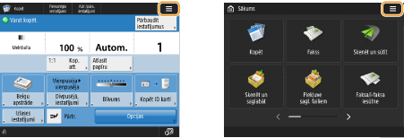 (Sākums). Ekrānā <Sākums> tiek parādīts funkciju pogu un darbību saraksts, no kura var piekļūt dažādām funkcijām. Ekrānā <Sākums> parādītie vienumi