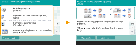 Funkcijų vadovo ir DUK puslapio peržiūraPaspauskite <Vadovėlis/DUK>, kad iškviestumėte ekraną, kuriame susipažinsite, kaip naudotis aparato funkcijomis, taip pat gausite patarimų dėl kopijavimo, nuskaitymo ir t. t. Peržiūrėkite šį ekraną, kai norėsite daugiau sužinoti apie esamas funkcijas bei kaip jomis naudotis. DUK puslapį taip pat galite pasiekti iš mobiliojo įrenginio.