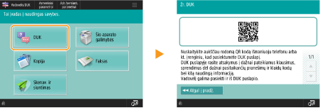 Paspaudus <DUK> parodomas QR kodas. Tada galite peržiūrėti aparato DUK puslapį nuskenuodami šį QR kodą mobiliuoju įrenginiu, tokiu kaip išmanusis telefonas arba planšetinis kompiuteris.