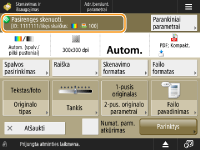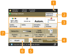 Rodoma parametrų būsena, pvz., raiška ir nuskaitymo formatas. Patvirtinkite parametrus, kad tinkamai nuskaitytumėte. Norėdami pakeisti parametrus, paspauskite mygtuką, esantį žemiau ekrano. Informaciją apie failų formatus žr. skyriuje