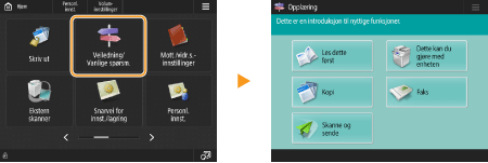 Vis funksjonsveiledningen og Vanlige spørsmål-sidenTrykk på <Veiledning/Vanlige spørsm.> for å vise et skjermbilde som introduserer deg til hva du kan gjøre med funksjonene på maskinen samt tips for å bruke kopiering, skanning osv. Vis dette skjermbildet når du vil finne ut mer om hvilke funksjoner som er tilgjengelig, og hvordan du bruker dem. Du kan også åpne Vanlige spørsmål-siden på en mobilenhet.