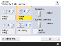Når skjermen for å velge originalstørrelsen visesHvis <Papirvalg> er angitt til <Auto>, kan det hende at skjermen for å velge originalstørrelse vises. Dette vises fordi originalstørrelsen ikke kan verifiseres og papir ikke kan velges automatisk når originaler med høy gjennomsiktighet, originaler med ekstremt mørk grunnfarge eller små originaler, blir plassert. Velg originalens størrelse, eller en størrelse nær originalen.