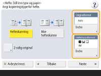 Trykk på <Endre> i <Originalformat> og velg originalstørrelse. Hvis du velger <Auto>, velges hefteformatet automatisk i henhold til originalstørrelsen.