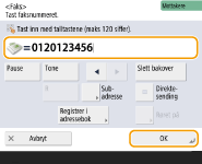 Sende fakser til utlandetTast inn det internasjonale tilgangsnummeret, landskoden og faksnummeret – i den rekkefølgen. Hvis du ikke kan koble til mottakeren i utlandet, må du trykke på <Pause> for å legge inn en pause mellom et nummer og tekstnummeret.