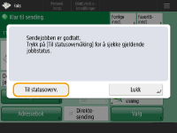 Når <Vis varsel når jobb godtas> angis til <På>, kan skjermbildet <Statusoverv.> vises fra det følgende skjermbildet som vises etter en sendejobb er mottatt. <Vis varsel når jobb godtas>