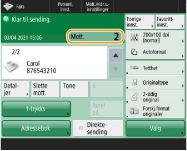 Faks/I-faks sendejobber: <Kvalitetprioritet> (<Hastighet/bildekvalitetprioritet for svart-hvitt-skanning>)Når flere telefonlinjer er angittDu kan velge telefonlinjen som skal brukes for å sende fakser ved å trykke på <Valg>
