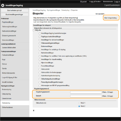 For å kryptere alle innstillingsdataene, velger du [Nivå 2] i [Sikkerhetsnivå].