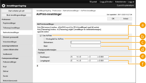 Hvis du logger på med administratorrettigheter, kan du også endre AirPrint-innstillingene fra siden for AirPrint.