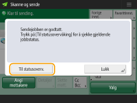 (Stopp) når det er flere sendejobber for å vise skjermbildet for å velge sendejobben du vil avbryte. Hvis sendejobben du ønsker å avbryte ikke vises, trykker du på <Sjekk andre jobber> for å vise <Send jobber>. Velg jobben som du vil avbryte og trykk på <Avbryt>.Slik sjekkes du statusene for sendte/lagrede dokumenterPå skjermbildet <Statusoverv.> kan du sjekke statusene for sendte/lagrede dokumenter. Dette skjermbildet lar deg sende/lagre dokumenter igjen eller avbryte sending/lagring etter å ha sjekket statusene. Kontrollere status og logg for skannede dokumenter