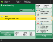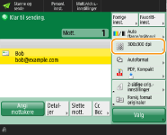<Orig.innhold Retning> velger <Øverst på bortre kant> eller <Øverst på sidekant> i henhold til retningen på originalen trykker du på <OK>.Angi flere mottakere, inkludert faksHvis du angir <Aktivere faks i skanne- og sendefunksjon> til <På> kan du angi faksmottakere fra skjermbildet Grunnleggende funksjoner for skanning (<Vis faksfunksjon>). Denne innstillingen er nyttig for å angi flere mottakere, inkludert fakser, for eksempel når du lagrer en kopi av en sendt faks på en filserver.