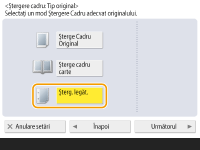 Când copiaţi documente originale care sunt mai mici decât dimensiunea hârtiei de ieşire, în imaginea copiată pot să apară liniile de cadru ale documentelor originale. Când copiaţi cărţi groase, pot să apară borduri întunecate. <Şterge Cadru> permite ştergerea acestor linii de cadru şi borduri întunecate. De asemenea, puteţi să setaţi aparatul astfel încât să nu copieze găurile de perforator de pe originale.