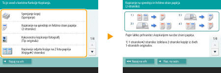 Ogled priročnika s funkcijami in strani s pogostimi vprašanjiPritisnite <Vadnica/Pog. vprašanja>, če želite prikazati zaslon, na katerem je predstavljeno, kaj lahko počnete s funkcijami naprave in tudi nasveti za kopiranje, optično branje in drugo. Na tem zaslonu lahko izveste več o razpoložljivih funkcijah in načinih njihove uporabe. Do strani s pogostimi vprašanji lahko dostopate tudi iz mobilne naprave.