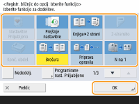 Registracija v <Nastavitve Priljubljeno>V <Nastavitve Priljubljeno> lahko registrirate pogosto uporabljene postopke kopiranja ter pogosto določene cilje in nastavitve za optično branje. Za dodatne informacije glejte Registriranje kombinacije pogosto uporabljenih funkcij.