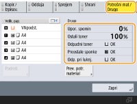 Preostalo količino potrošnega materiala lahko preverite v vmesniku Remote UI (Oddaljeni uporabniški vmesnik). Preverjanje statusa stroja