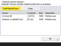 Tudi če je v <Preostali dnevi> prikazano <Potrebna zam.>, ne opravite zamenjave, dokler se na območju prikaza stanja (na dnu zaslona na dotik) ne prikaže sporočilo, ki vas poziva k zamenjavi potrošnega materiala.