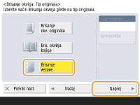 Pri optičnem branju izvirnikov, ki so manjši od velikosti optičnega branja, se lahko na optično prebrani sliki prikažejo obrisi okvira izvirnikov. Ko optično preberete debelo knjigo, se lahko prikažejo temne obrobe. Ta funkcija omogoča brisanje tovrstnih črt in temnih robov. Napravo lahko nastavite tudi tako, da ne kopira lukenj za vezavo na izvirnikih.