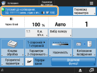 Відображається стан параметрів, наприклад коефіцієнт масштабування під час копіювання, формат паперу та кількість копій. Обов’язково підтвердьте параметри, щоб скопіювати правильно. Щоб змінити параметри, натисніть кнопку під розділом про відображення.