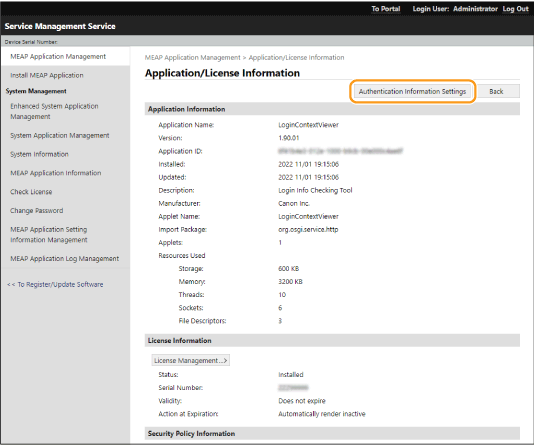 برای تنظیم اطلاعات احراز هویت، روی [MEAP Application Management]